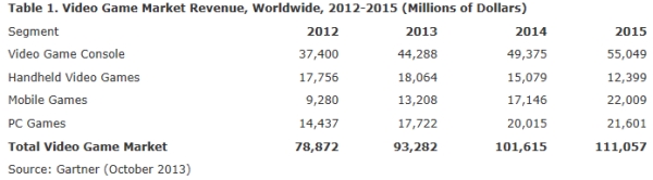 Il mercato dei videogiochi internazionale, considerando hardware e software per console, online, mobile e PC, raggiungerà i 93 miliardi di dollari entro la fine del 2013, con una crescita consistente rispetto ai 79 miliardi di dollari. Grazie all'impulso dato dal settore mobile e dall'introduzione delle nuove console, il mercato raggiungerà il tetto dei 111 miliardi di dollari entro il 2015. I dati provengono da Gartner.