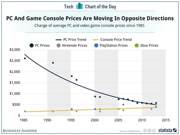 Stratechery ha condotto un ampio studio sul mercato dei videogiochi, dal quale emerge un dato interessante a proposito dei prezzi al pubblico delle console da gioco e dei PC. Secondo lo studio, infatti, il prezzo delle console sarebbe cresciuto di pari passo alla riduzione del prezzo dei PC.